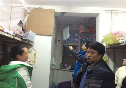 查寝期间,陈书记带领着老师们对学生宿舍进行随机巡访、抽查,详细了解了搬迁工作后学生寝室所遗留的问题。老师们详细记载了7栋320寝室墙壁漏水、316寝室门口道路铁皮破损;14栋515寝室洗手间水管、窗户损坏,520寝室灯泡损坏,521寝室水管漏水等情况,并现场就宿舍生活设备老化及损坏等问题提出了具体的解决意见。
