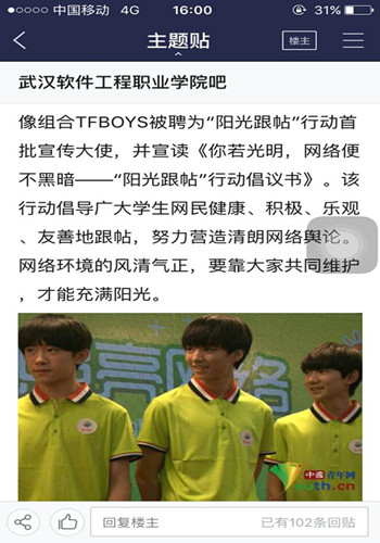 同时,学院阳光学习小组和青协分会在我校官方百度贴吧上发起了参与“阳光跟帖”行动的倡议书,共计80条回帖量,旨在带动全校同学理性发帖,文明跟帖,共同创建文明良好的网络环境。