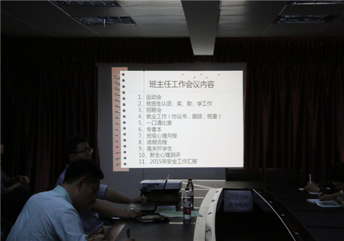 2点30分,相关院领导、全体班主任、辅导员及就业专员准时于4号教学楼6楼会议室召开了专题培训会。首先,李书记就本学期班主任工作的开展提出了相关要求与殷切希望。随后,大三年级组组长何波老师详细介绍了今年校运动会的工作进度及具体安排。张科长一一解说了贫困生认定及奖助学工作、招聘会、就业工作、“一口清”比赛、专套本招生、班级心理月报、学生请假流程、高关怀学生、新生心理测评等9项学生事务的工作内容、大致方法及注意事项,今后,三个年级组将分头针对这9项学生管理工作进行全面详细的培训。