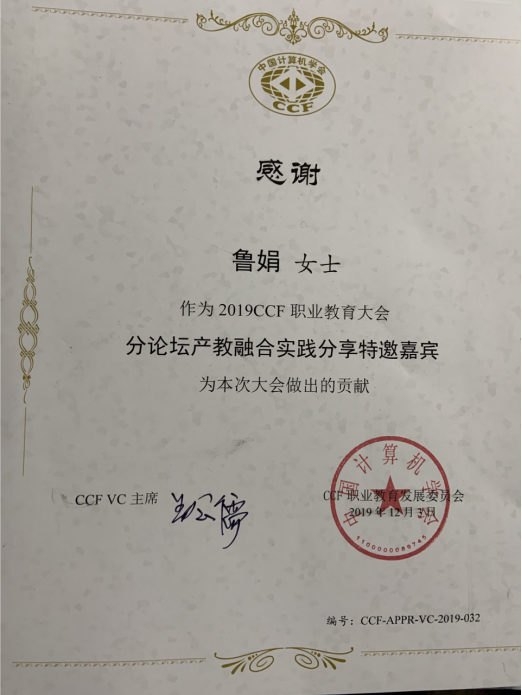 我院鲁娟老师还正2019年度CCF职业教育大会上作了《在服务经济社会发展中提质升级—高职数字媒体应用技术专业建设探讨》的报告。分析高职数字媒体应用技术专业现状,从人才培养模式改革、教育教学模式改革、专业实训生产体系建设、产教融合服务社会等方面探索专业转型服务新兴产业。