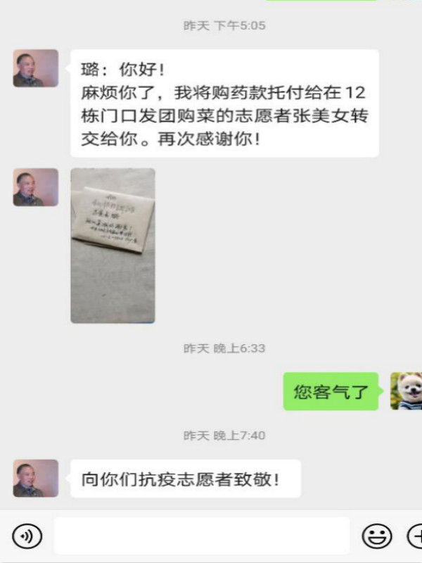 我负责的网格内有位独居老人,在网格群里说了一次他的带状疱疹发作,需要阿昔洛韦乳膏,不会网付购买,然后就不再发言。我单独添加微信也一直不通过。看在眼里,急在心里,我在网格群里询问老人的联系方式,终于从物业管家处得到了回复。我们社区对接的药房需要三天集中送药一次,于是,我主动联系了另外两家药房,自己付钱买药再送到老人家里,同时把网格内居民急需的降压药和糖尿病患者用药也一并购买。收到老人发来的感谢信息,真的很开心,在现在非常特殊的情况下,我们在工作中稍微多关注一点、主动一点,就可以帮到多一个人解决困难。