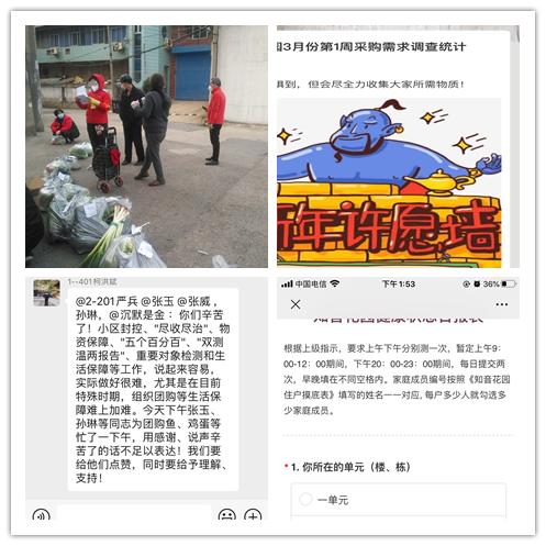 根据疫情防控指挥部关于实行“双测温两报告”制度的要求,小区从2月21日起居家人员每日两次(上午、下午各一次)测量体温,超过37.3℃的业主必须立即如实向社区和工作单位报告。孙琳老师利用专业优势,与另一名志愿者共同制作了小程序——在线填写《住户摸底表》(只用填写一次)和《日报表》(每日早晚记录两次),所有居民打开小程序非常便捷的每日填写并提交,他们从后台导出数据及时汇报给社区。小区封控后,要做好所有居民的生活物资保障,看似简单的事情真的一点也不简单,每位业主的需求不一、供应商又大多是套餐捆绑销售,于是,孙琳老师提前一周会在小程序中制作下一周的采购需求调查统计,再根据各类需求分类汇总,联系不同的供应商。每次分发物资时,面对大量的物品以及出来领菜的居民,她经常会忙的一身汗。