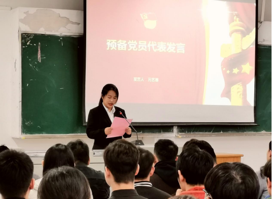 随后,教师党员代表为新党员代表佩戴党徽。全体参会人员高举右手,紧握拳头,在学院党总支书记胡英同志领誓下,面向党旗庄严宣誓,铮铮誓言响彻会场。宣誓结束后,预备党员代表元艺蓉同志上台发言,她表示对入党誓词要“终生铭记,身体力行”。