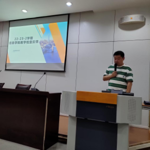 随后,教学科科长聂巍对2022—2023年第2学期教学检查工作进行了反馈。聂科长首先分析了上学期学院在全校教学检查中的整体水平,再从教学检查的实施方案、教案、作业及课堂教学等7个分项介绍了学院的检查结果情况并针对性提出解决办法,同时对教师的教学规范也提出了细致的要求,最后公布了新学期全面使用新版教学设计、增加平时教学过程性考核成绩、细化听课评课活动等新举措。