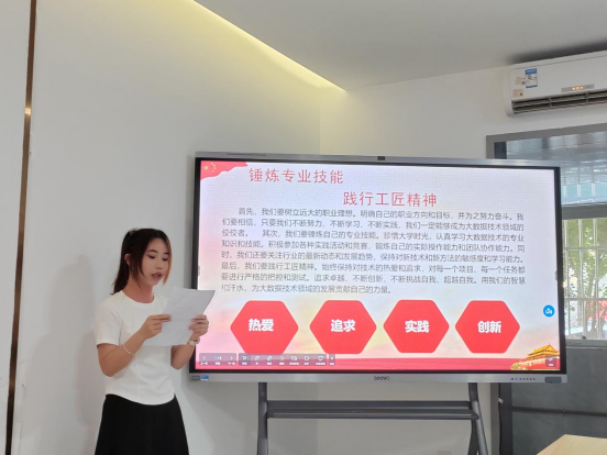 活动现场,他们以饱满的热情、优美的文辞、流畅的语言以及出色的PPT,声情并茂地讲述着心怀工匠精神的重要意义,并结合所学专业,畅谈锤炼专业技能与践行工匠精神之间的逻辑关系。人工2204班丁涛是退伍复学的军人,他从专业知识的学习与应用、精益求精的学术态度、服务社会的使命担当这三个方面进行讲述。大数据2202班的黄思媛同学从工匠精神是中华优秀传统文化的重要内容和宝贵财富,是新时代的精神指引出发阐述自己的观点。软件2310班的唐怡菲将工匠精神与时代创新紧密结合,讲述中国制造、中国创造、中国建造共同发力取得的显著成就。