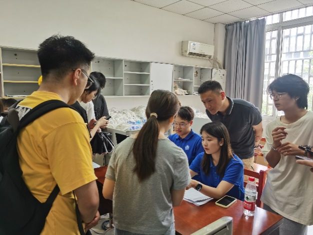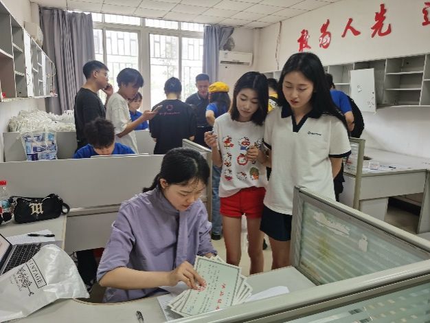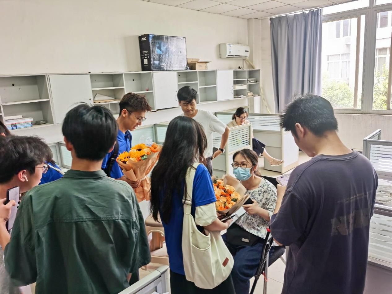 典礼结束后,四号教学楼办公室前很快排起了长队。毕业班辅导员们早已就位,核对信息、发放毕业证、解答疑问,每个环节都有条不紊。同学们捧着鲜花前来,感谢辅导员们三年的付出;许久未见的同学们,热情谈论着工作近况。而最令人动容的是邓丹老师的身影——她在腿部手术后尚未完全康复,仍拄着拐杖坚持到岗,为学生们送上毕业前最后的叮嘱。有学生悄悄在留言墙上写下:“早日康复”的祝福,短短一行字凝聚着全班同学的牵挂。离校手续办理现场,充斥着笑声与感叹声,辅导员们穿梭其间发放定制的纪念帆布袋和纪念冰箱贴。
