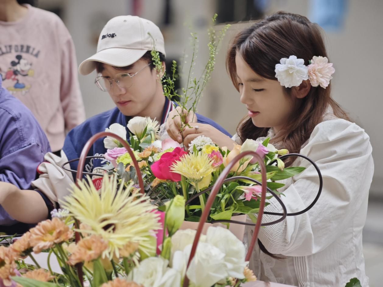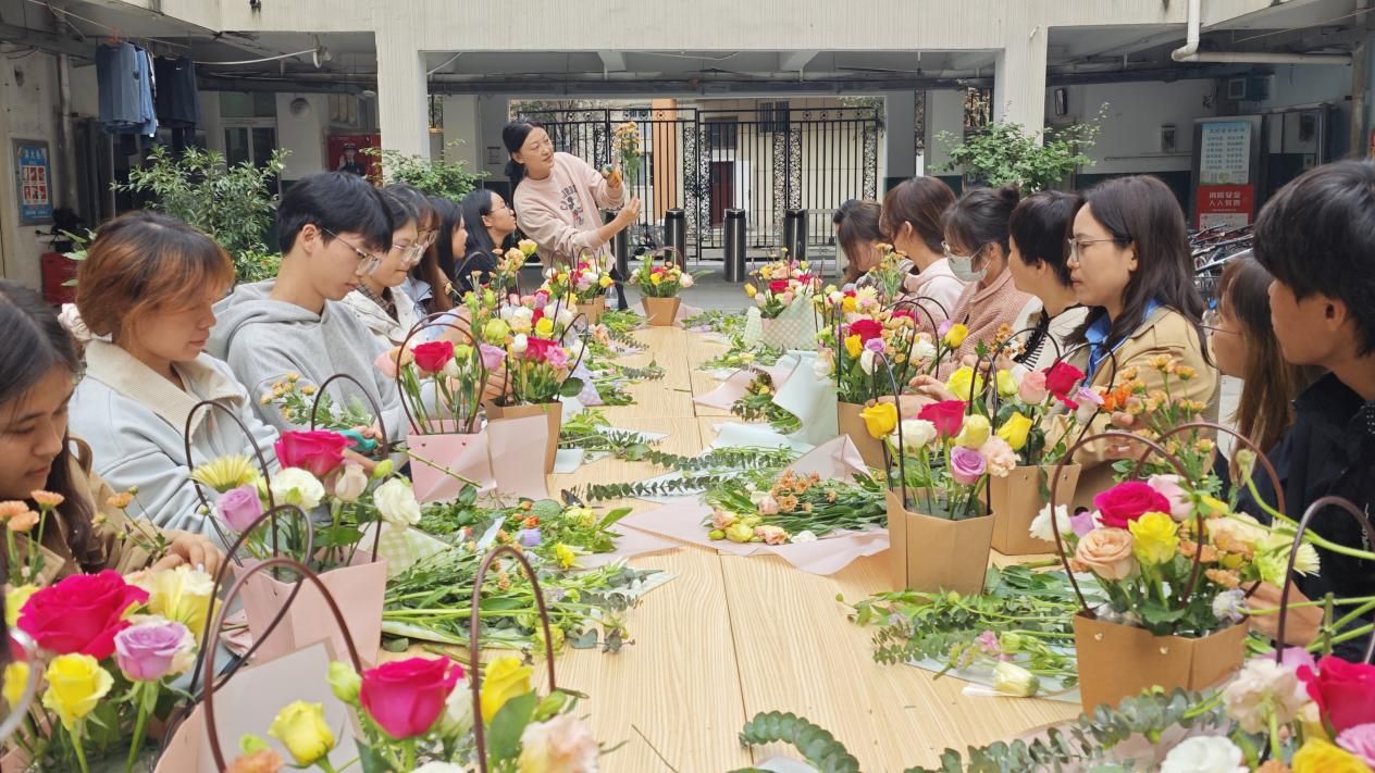 实操环节中,师生们围坐一堂,共同领取花材与工具,开启创意创作之旅。辅导员们不时与身边的同学交流搭配思路,分享自己的审美见解,耐心倾听同学们的学习感悟。大家小心翼翼地修剪枝叶、调整花材角度,原本零散的花材在一双双巧手下逐渐变成错落有致、独具匠心的“指尖艺术”。