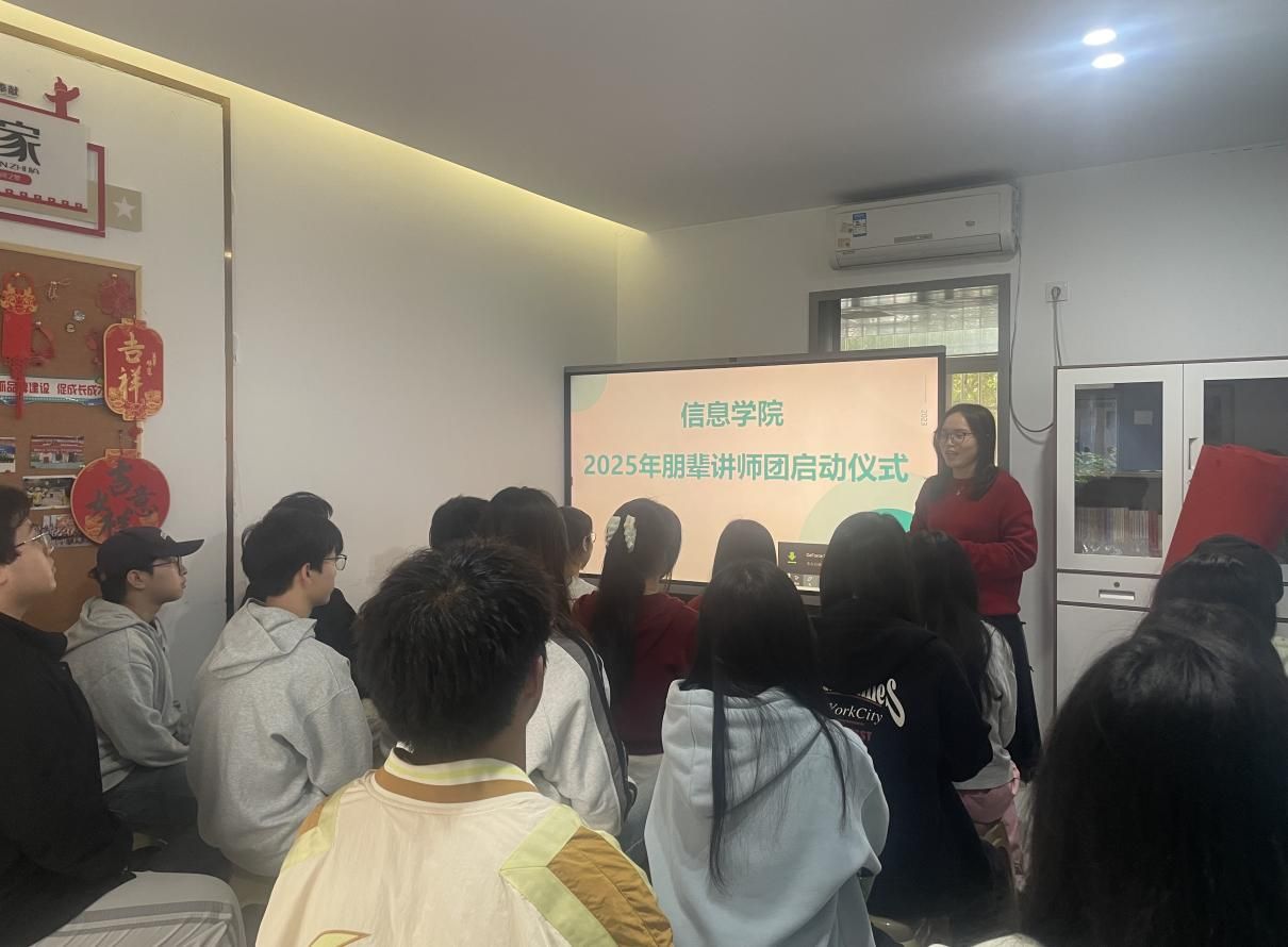 (通讯员:梅杰)为充分发挥优秀学生的引领示范作用,通过“传、帮、带”的形式帮助同学们更好地适应大学生活,掌握课业知识。11月7日中午,信息学院在12栋“一站式”学生社区101室举行2025年度“朋辈讲师团”启动仪式及朋辈互助分享活动,学生科长、24级辅导员代表、23级朋辈讲师代表、全体24级朋辈讲师共18人参加。
