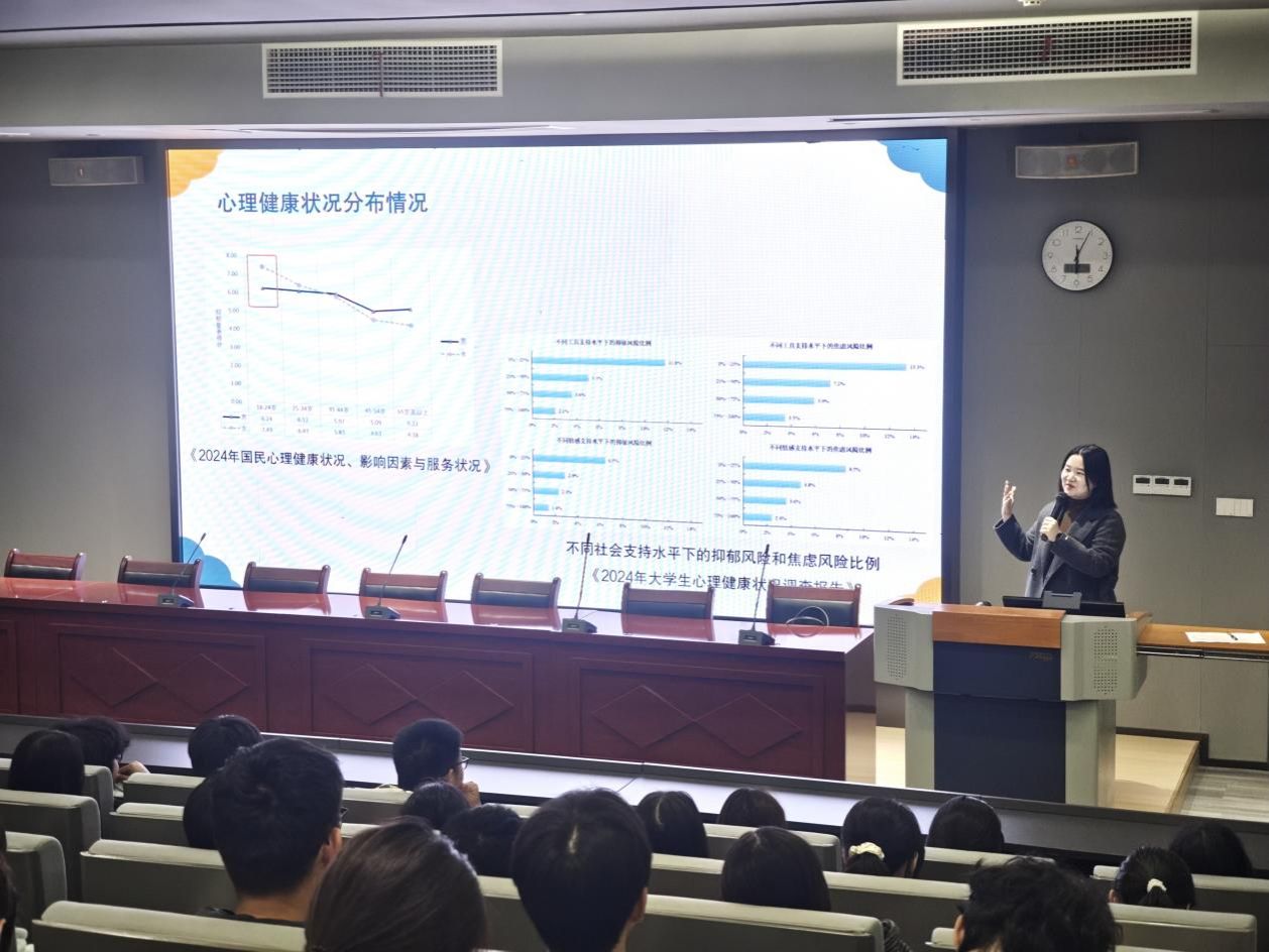 此外,讲座还聚焦心理障碍识别与危机预防,通过一系列典型案例,清晰阐释了焦虑障碍、抑郁症、双相情感障碍、强迫障碍的核心症状,列出了常见的危机信号,并提供了直接询问、非评判性支持、联动跟进等危机干预方法。活动现场,老师还分享了校内心理咨询预约方式、校外精神卫生机构地址及 24 小时心理热线等资源,为同学们搭建起全方位的心理支持平台。
