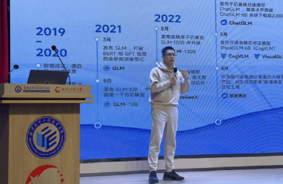 本次实训营特邀智谱AI算法工程师、硕士毕业于德州大学的资深专家担任主讲。其在自然语言处理(NLP)模型训练与产业应用方面具有丰富经验,长期专注于代码大模型与Embedding模型的训练优化,并主导了CodeGeeXAgent功能的完整研发与迭代。讲座中,他以“让机器像人一样思考”为切入点,深入浅出地梳理了大模型技术发展脉络,阐释了GLM模型在教育、科研、创作、编程等场景中的落地价值,为学生们构建起系统而前沿的AI认知框架。