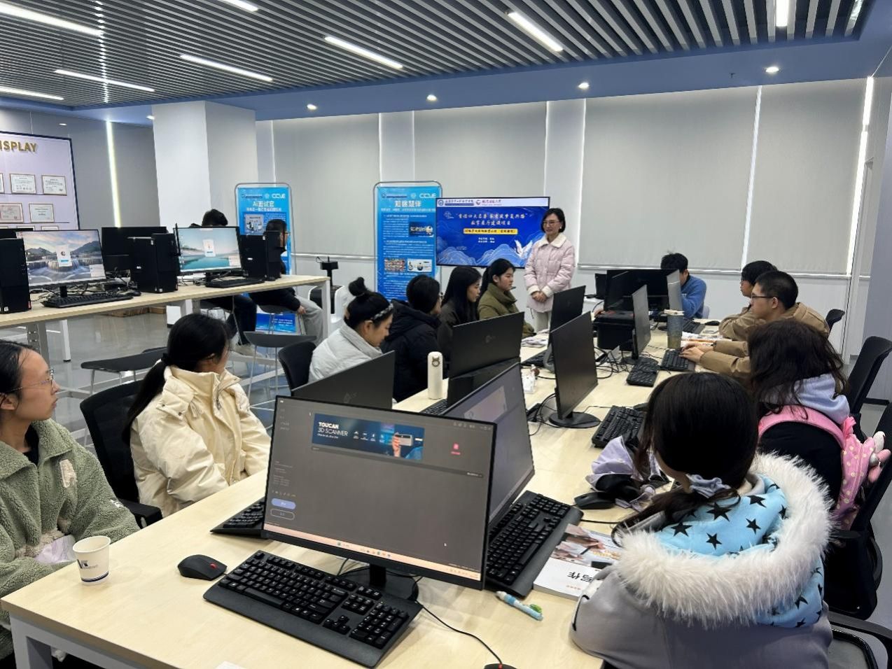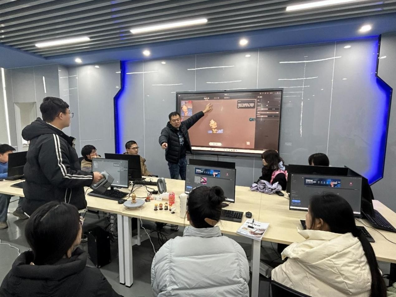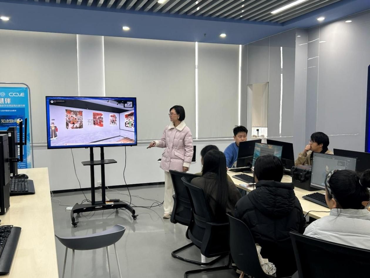 课程以“重读四大名著,书香筑梦复兴路”数字展厅建设项目为切入点,依托前沿数字技术激活中国古典文学瑰宝的时代生命力,巧妙将课程思政元素融入教学案例之中。授课过程中,通过展示数字展厅内多媒体数据融合、数字孪生、虚拟游览等技术的应用成果,引导学生直观感受数字技术赋能文化传播的创新实践路径;以互动提问的方式启发学生梳理传统三维软件正向建模的基本流程与耗时特点,进而引出逆向建模与正向建模的核心差异,点明逆向建模在提升建模效率、优化创作流程中的关键价值。随后,夏敏副教授系统讲解了3D数字化逆向建模的核心技术要点与实操规范,课堂氛围热烈活跃,学生参与热情高涨。